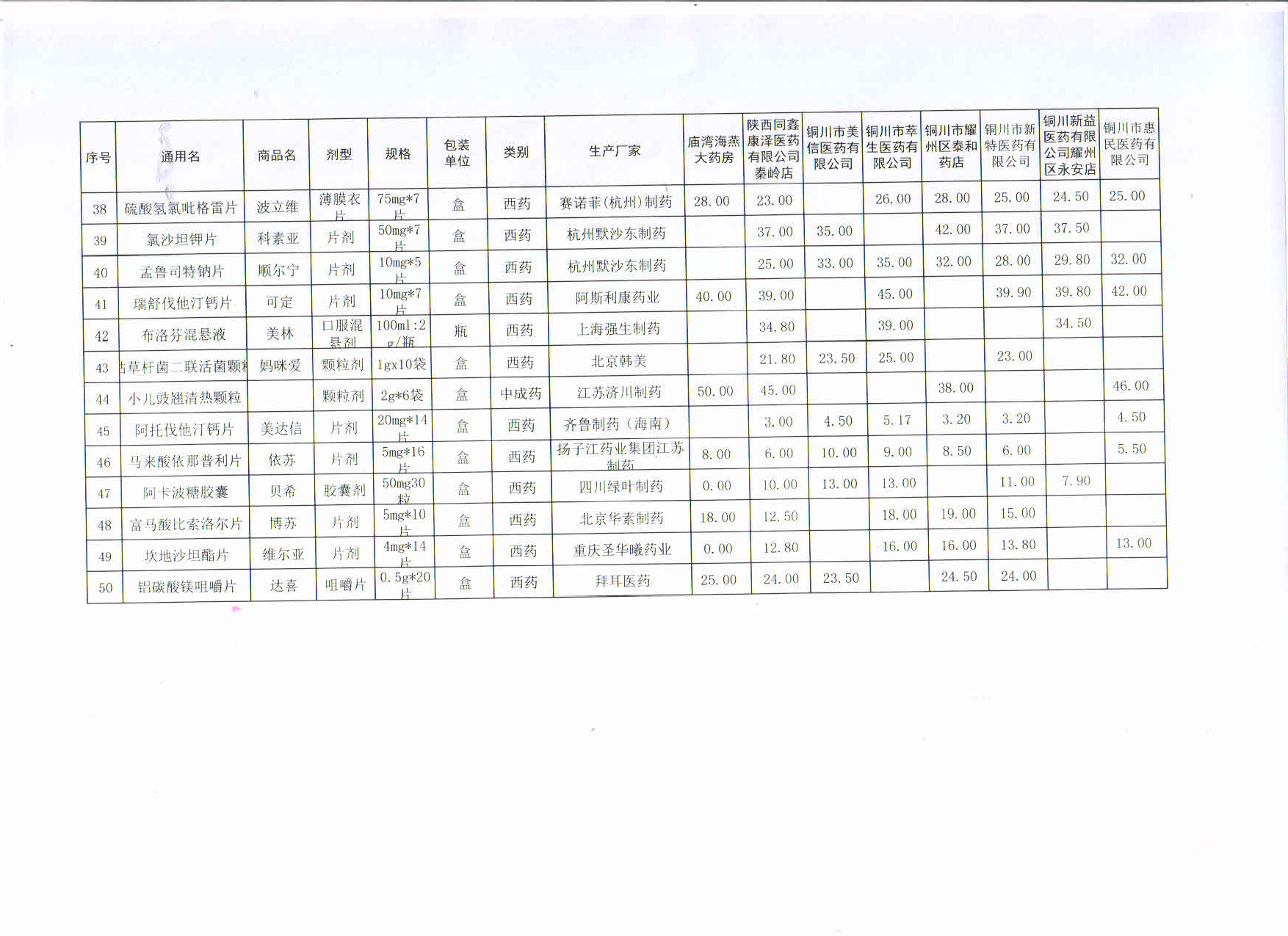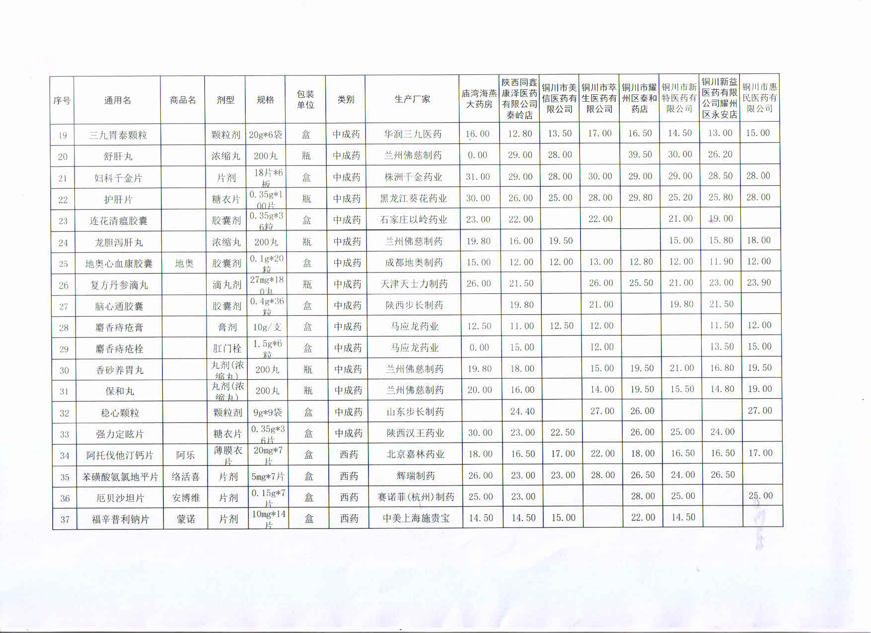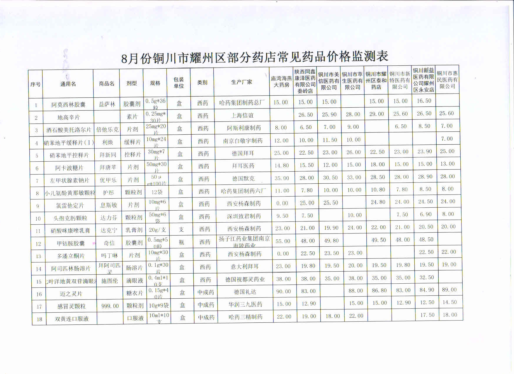 8月份铜川市耀州区部分药店常见药品价格监测表