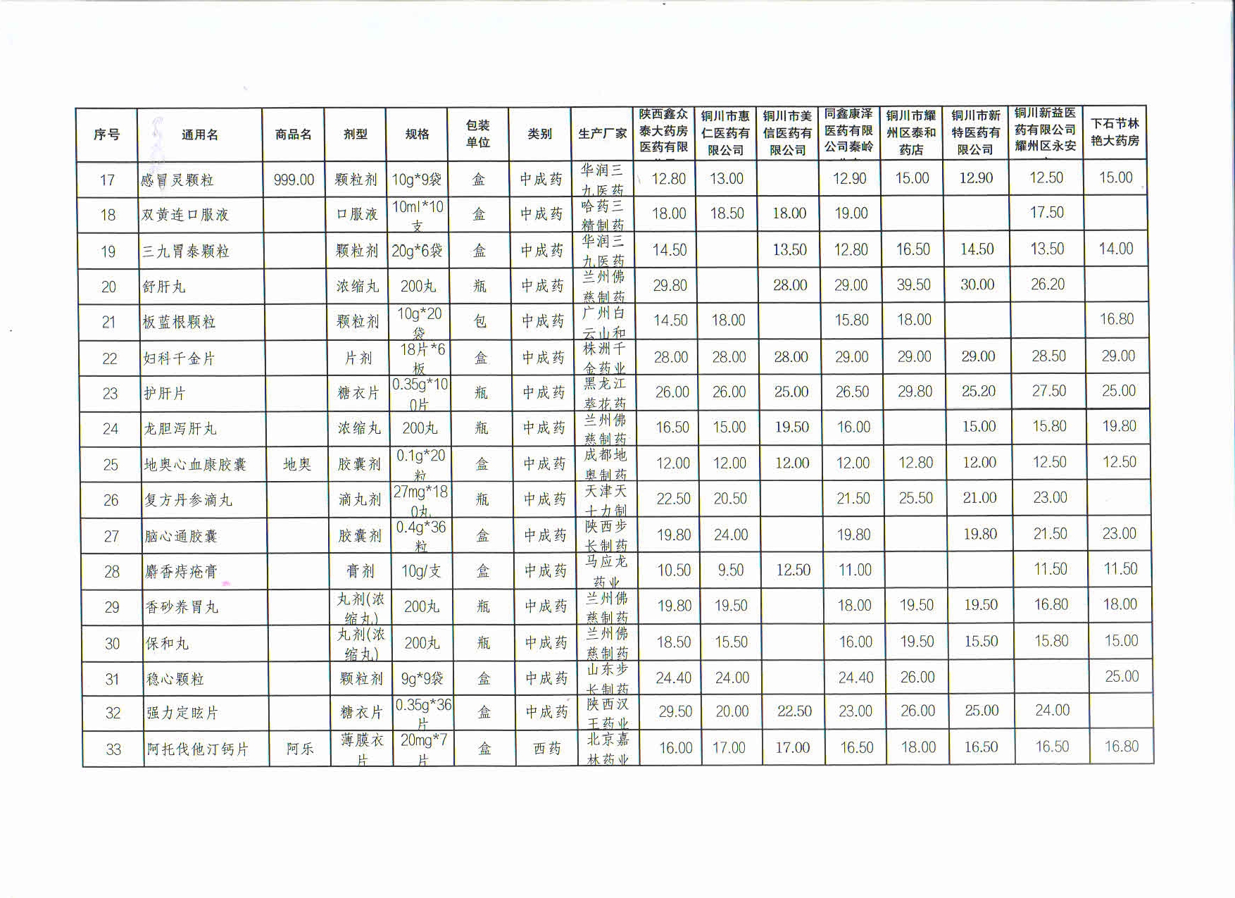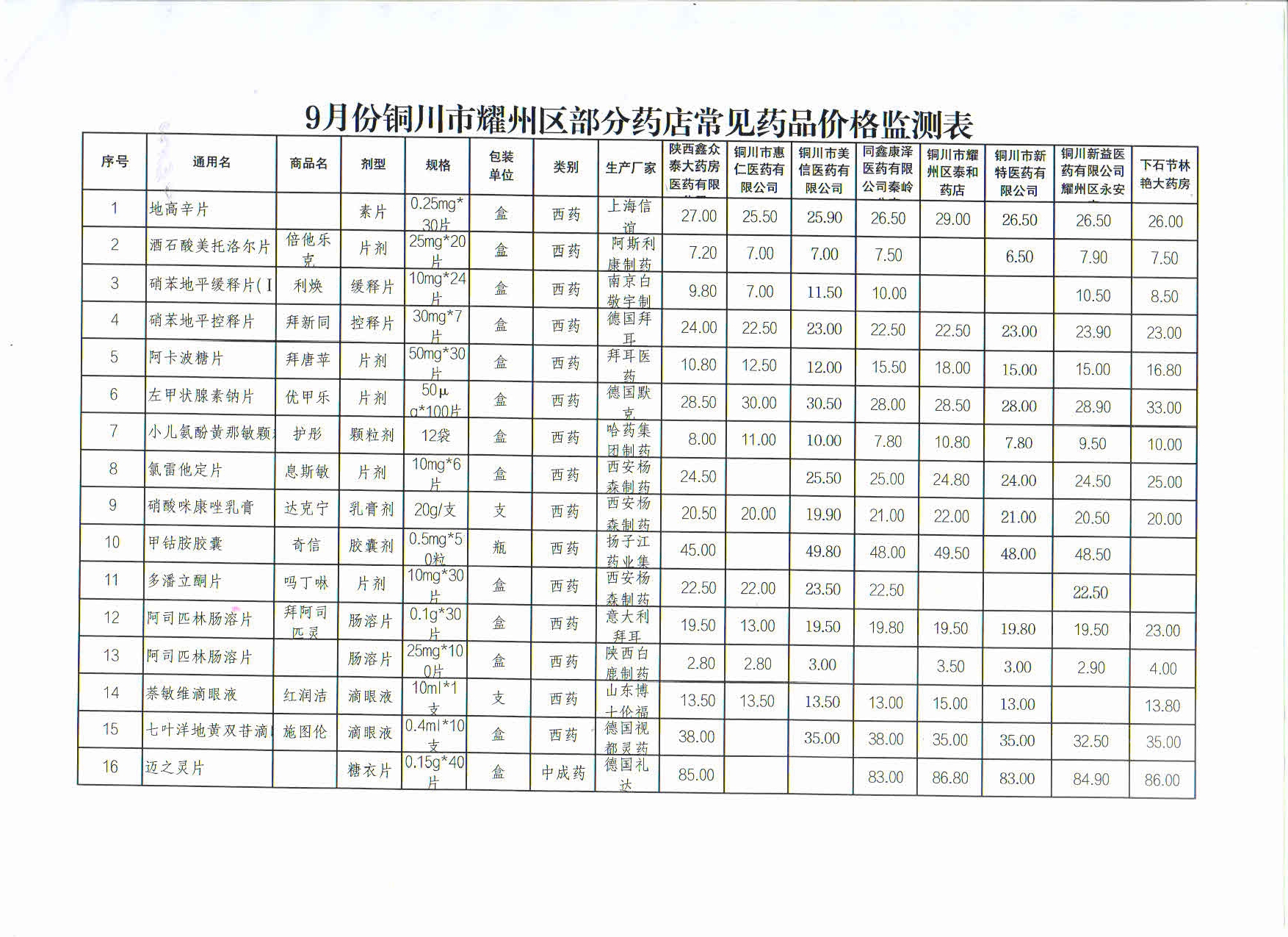 9月份铜川市耀州区部分药店常见药品价格监测表