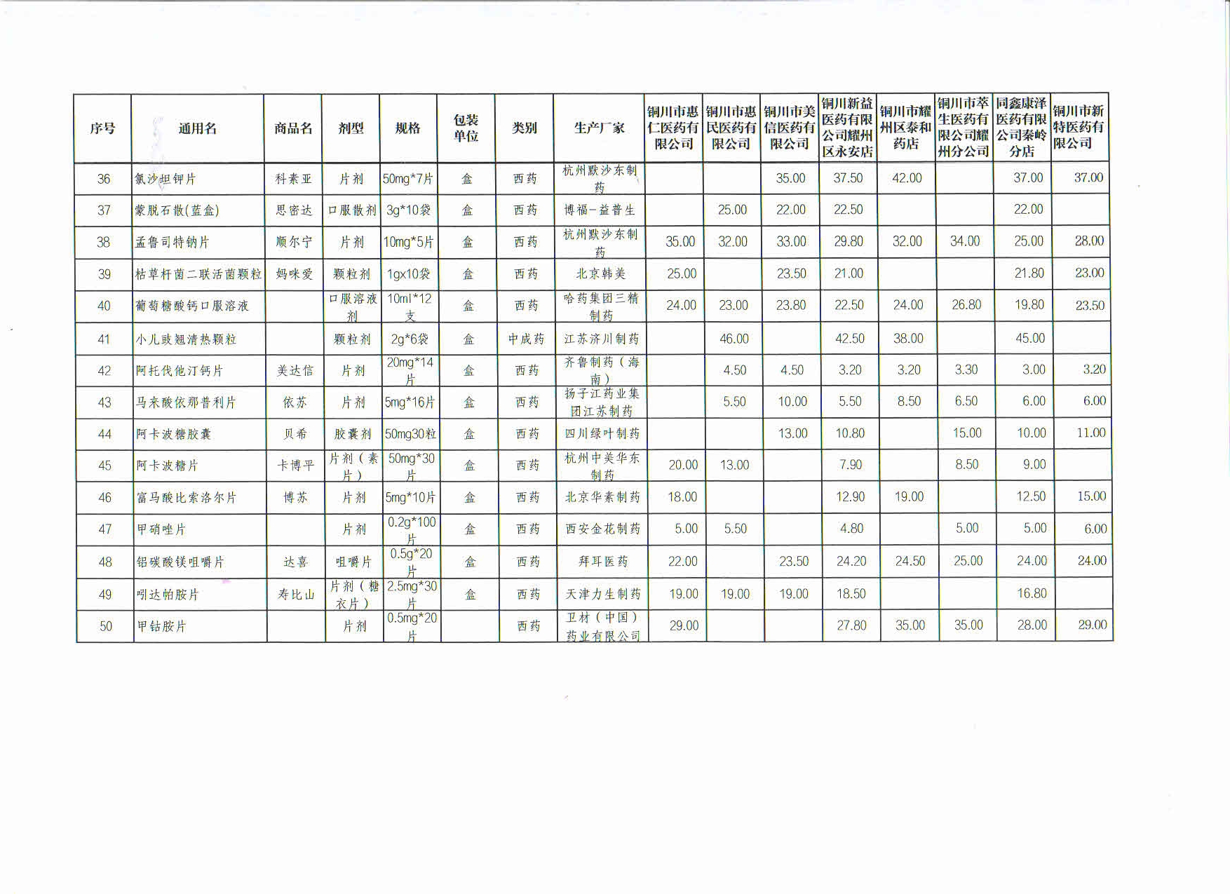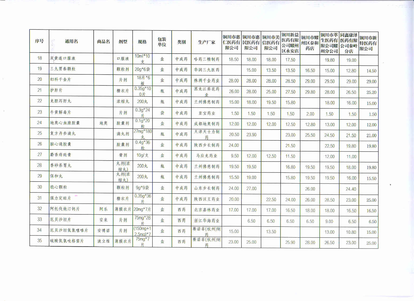 10月份铜川市耀州区部分药店常见药品价格监测表