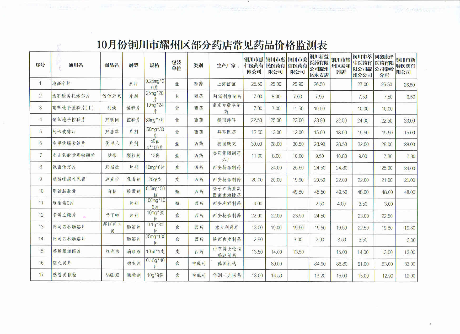 标题:10月份铜川市耀州区部分药店常见药品价格监测表, 正文: